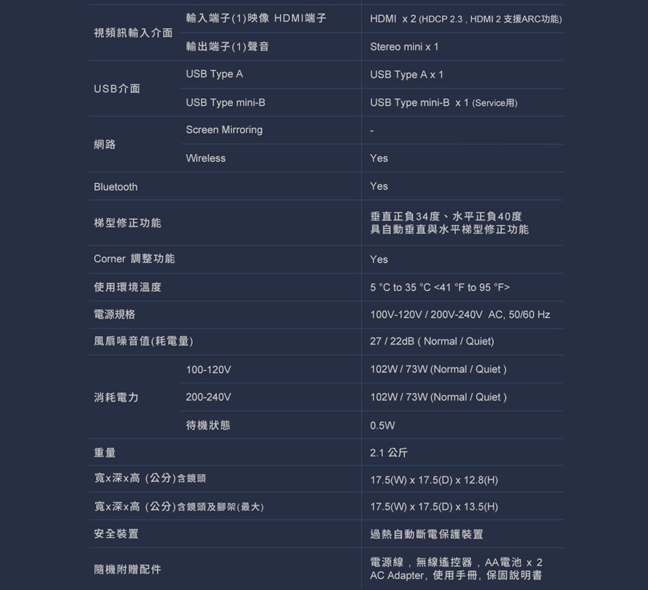 品牌 EPSON 愛普生 型號 EF-12 類型 微型 顏色 黑色 產地 其他國家 尺寸(長x寬x高)(cm) 17.5x17.5x13.5(含腳架) 投影畫面尺寸 30" to 150" 投影亮度(lm) 1000流明 對比 over 2,500,000:1(動態) 投射比例 1 投射距離 - 畫面比例 16:9, 4:3 支援解析度 1080P HDTV相容性 - 燈泡最大壽命(小時) 20000/20000小時 解析度 Full HD (1920x1080) 內建喇叭 有內建喇叭 電源供應 100V-120V / 200V-240V AC, 50/60 Hz 消耗功率 100-120V 102W/73W 、200-240V 102W/73W 重量(g) 2100 保固 一年 BSMI認證碼 - BSMI許可字號 - 備註 上述規格如有錯誤,請以原廠公告為準。 商品保證